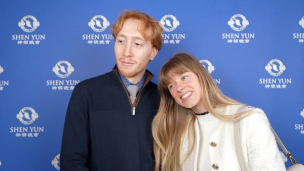 2025年12月20日晚,盧森堡財務審計師Thibault Mailfert(左)與友人Marine Lorin Huchard在法國阿姆內維爾大劇院(Galaxie Amnéville)觀看了神韻國際藝術團的演出。(新唐人電視台)
