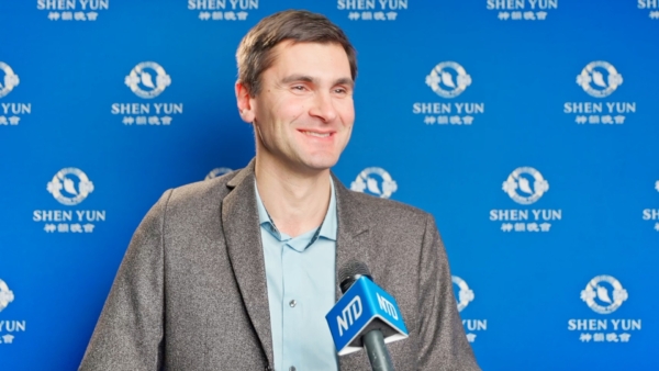 2026年1月3日,獲獎鋼琴家、作曲家Vestards Šimkus觀賞了美國神韻巡迴藝術團在拉脫維亞首都里加的戴列斯劇院(Dailes Theatre)的演出。(新唐人電視台)