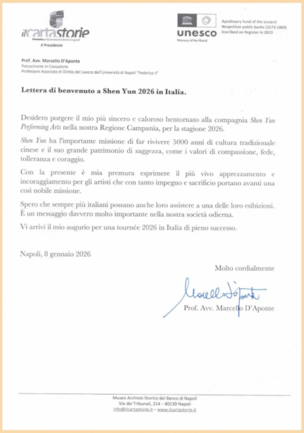1月8日那不勒斯文化名流Marcello D’Aponte 馬塞洛‧達蓬特先生向神韻發來賀信。賀信中寫道:「我謹代表坎帕尼亞大區,熱烈歡迎神韻藝術團再次來到我們這裡演出。