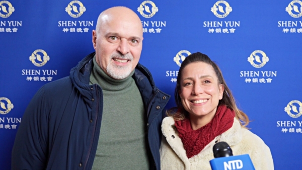 2026年1月20日晚,廣播設施公司經理Fabrizio Rebuzzi和友人Serena De Simoni觀看了神韻紐約藝術團在意大利米蘭阿爾欽博第劇院(Teatro degli Arcimboldi)的首場演出。(新唐人電視台)