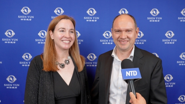 2026年2月21日,資深人事專員Carmen Fomin(左)與首席系統工程師Dmitri Fomin(右)在印第安納波利斯巴特拉藝術中心克勞斯紀念堂(Clowes Memorial Hall, Butler Arts Center)觀賞神韻巡迴藝術團演出。(新唐人電視台)