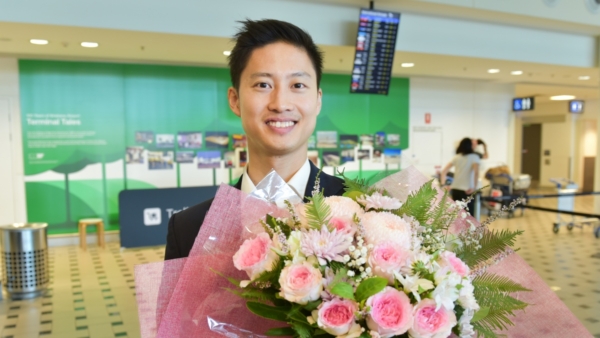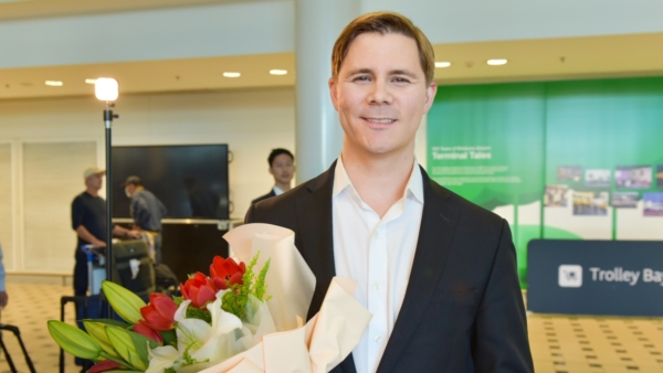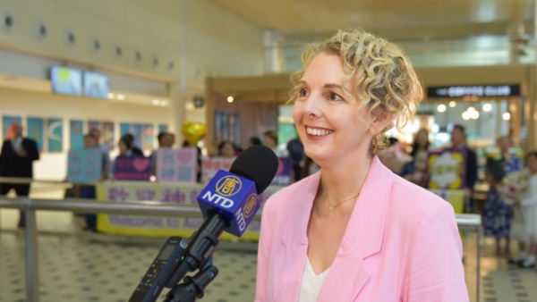 在布里斯本國際機場接機大廳,當地粉絲們手持「歡迎神韻藝術團」的橫幅和鮮花,高聲歡呼。