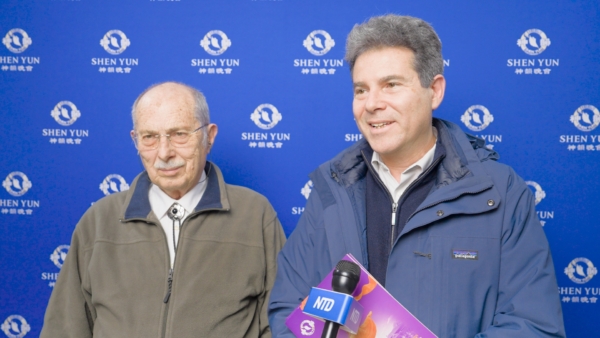 2026年2月27日下午,前船舶工程師Oscar Castanio(左)與船舶工程師Andrea Castanio(右)觀看了神韻國際藝術團在意大利熱那亞卡洛·費利切劇院的演出。(新唐人電視台)
