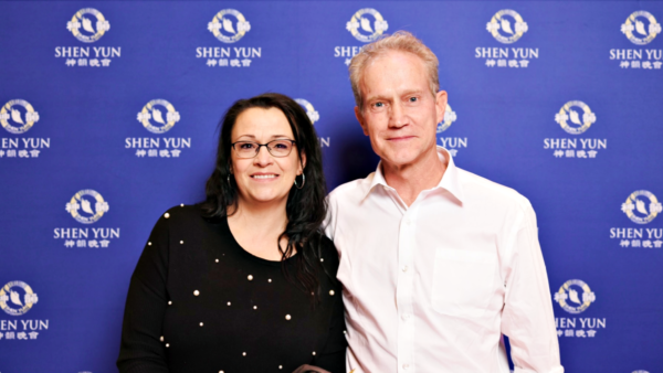 2026年3月13日晚,雕塑家Aleina Peterson(左)和建築項目經理Patrick Peterson(右)觀看了神韻巡迴藝術團在美國鹽湖城埃克爾斯劇院(George S. and Dolores Doré Eccles Theater)的首場演出。(新唐人電視台)