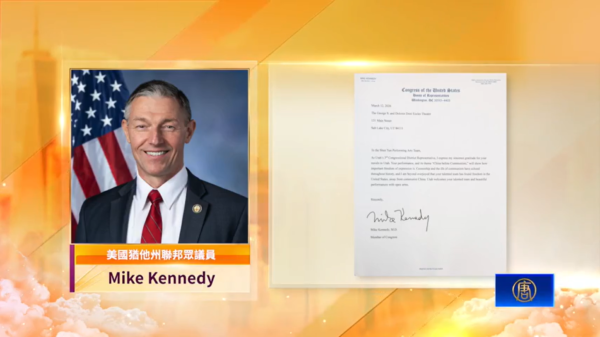 美國猶他州聯邦眾議員Mike Kennedy向神韻藝術團發來褒獎信,感謝神韻蒞臨猶他州演出。他在信中說,「作為猶他州第三選區的聯邦眾議員,我對各位蒞臨猶他州演出表達最誠摯的謝意。」「神韻的演出以及『共產主義之前的中國』這一主題,深刻展現了言論自由的重要性。歷史證明,審查制度與共產主義所帶來的種種禍害影響深遠。我感到無比欣慰,因為神韻優秀的團隊在美國找到了自由,得以遠離共產主義的中國。猶他州全體鄉親將張開雙臂,歡迎神韻傑出的團隊以及精彩絕倫的演出。」