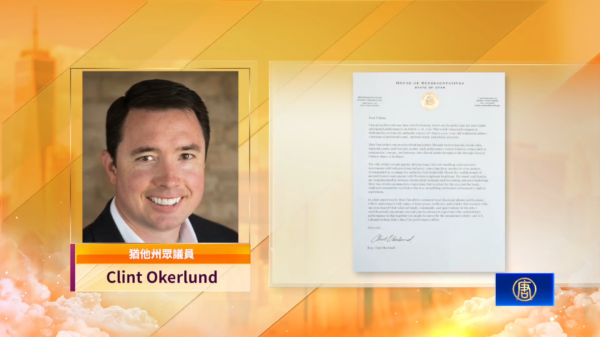 猶他州眾議員Clint Okerlund也發來賀信歡迎神韻藝術團的光臨。他在信中說,「享譽全球的藝術團體,始終致力於恢復中國五千年傳統文化的精髓——這是一份融合了深厚美學、精神內涵與卓越藝術成就的珍貴遺產。」「神韻將帶領觀眾踏上一段非凡的旅程,穿梭於古代傳說、英雄故事、王宮與天國之間。每一場演出都將慈悲、勇氣與諧和等普世價值,精妙地編織進充滿生命力的故事中,並透過最頂尖的中國古典舞呈現在觀眾面前。」