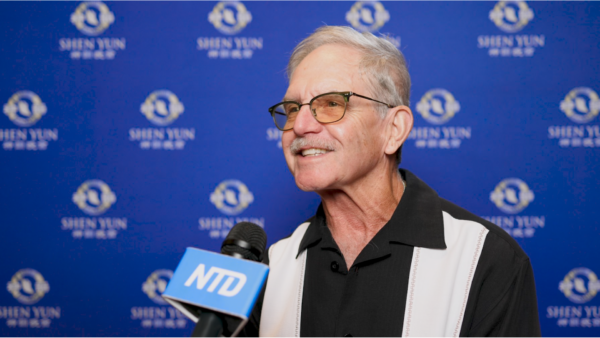 美國陸軍退役中士Virgil Pfautch:「這是我第十五次看神韻了,我和妻子每年都來,除了疫情爆發那次取消之外。我們太喜歡神韻了。我喜歡舞蹈,尤其是那些女士,她們撐著陽傘,每次演出都有新意。」