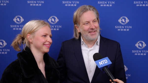 2026年3月29日下午,挪威知名作曲家、導演、演員Stein Johan Halvorsen(右)與友人Johanna觀看了美國神韻紐約藝術團在紐約林肯中心的第六場演出。(新唐⼈電視台)