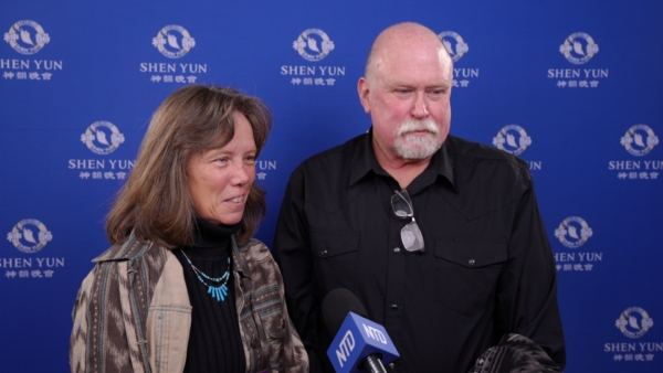 2026年3月29日下午,剪輯師Eileen Ford(左)與先生Jim Ford觀看了美國神韻紐約藝術團在紐約林肯中心的第六場演出。(新唐⼈電視台)