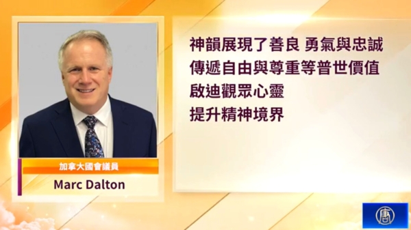 加拿大國會議員Marc Dalton在賀信中讚賞:「神韻展現了善良、勇氣與忠誠,傳遞自由與尊重等普世價值,啟迪觀眾心靈,提升精神境界。」