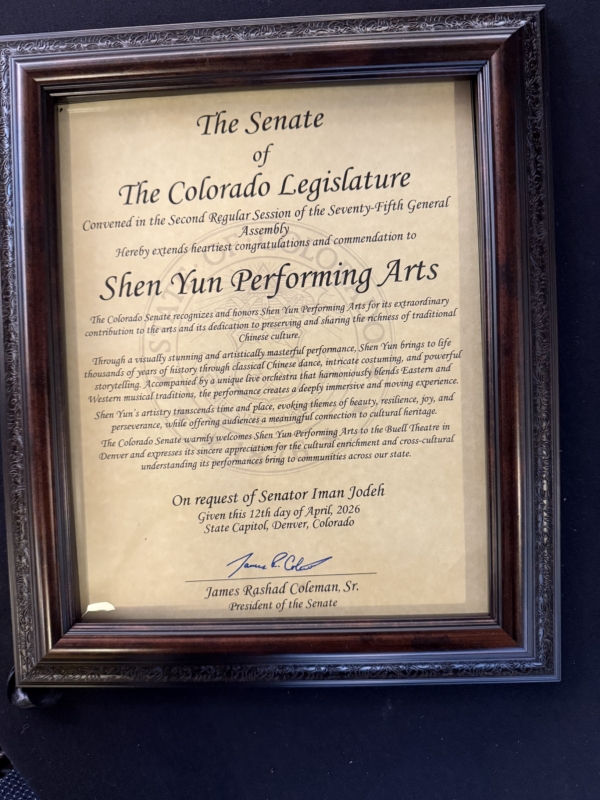 「科羅拉多州參議院熱烈歡迎神韻藝術團來到丹佛的布爾劇院,並衷心感謝神韻的演出為全州各地社區帶來的文化豐富性和跨文化理解。」